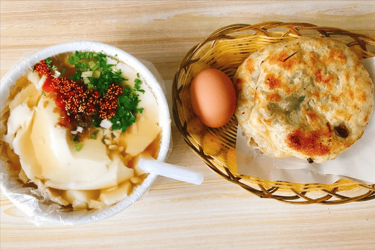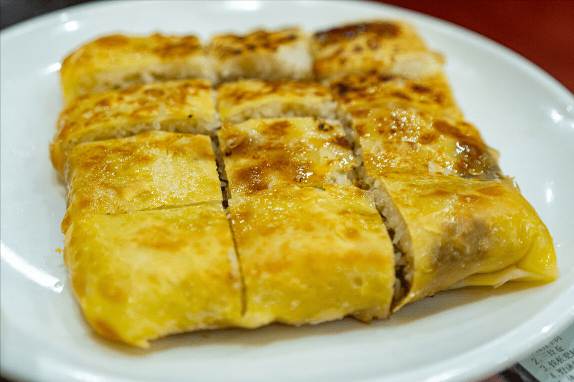 三鲜豆皮,用的是糯米、肉丁还有香菇、笋等食材,经过油煎之后,外皮金黄焦脆,内馅软糯鲜香,配上一杯米酒,吃的那才叫一个爽。