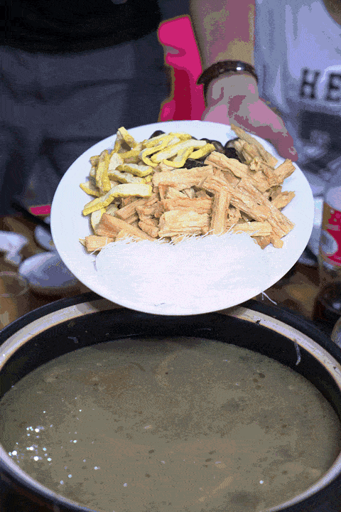 斋菜煲的锅底是斋菜,但现在爱吃肉的朋友,也可以加入肉类。锅沸腾后,满满当当一大锅,色泽分明,气味鲜香。