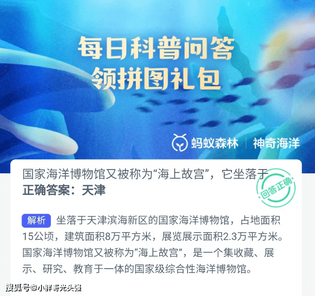 蚂蚁森林之神奇海洋答案:国家海洋博物馆又被称为“海上故宫”,它坐落于哪里?正确答案:天津。