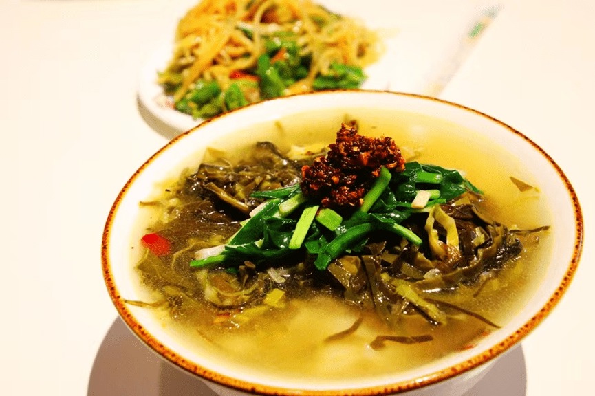 天水浆水面又称酸菜饭,是甘肃天水的一种传统面食小吃。它是用发酵的酸菜炝炒做卤而制成的面条。一般上好的酸菜用一种叫“苦苣”的野菜腌制,味酸,能生津止渴、清热祛暑。