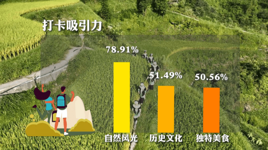 是什么吸引人们想去这些城市打卡?大调查数据显示,排在首位的是自然风光(78.91%),近80%的人被原生态的自然景观所吸引,想去看风景,其次是历史文化(51.49%)和独特美食(50.56%)。