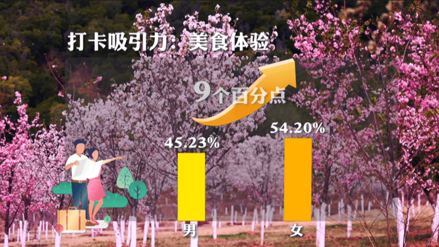 交叉对比发现,女性比男性更喜欢打卡独特的美食体验,选择比例高出近9个百分点(女54.20%,男45.23%)。