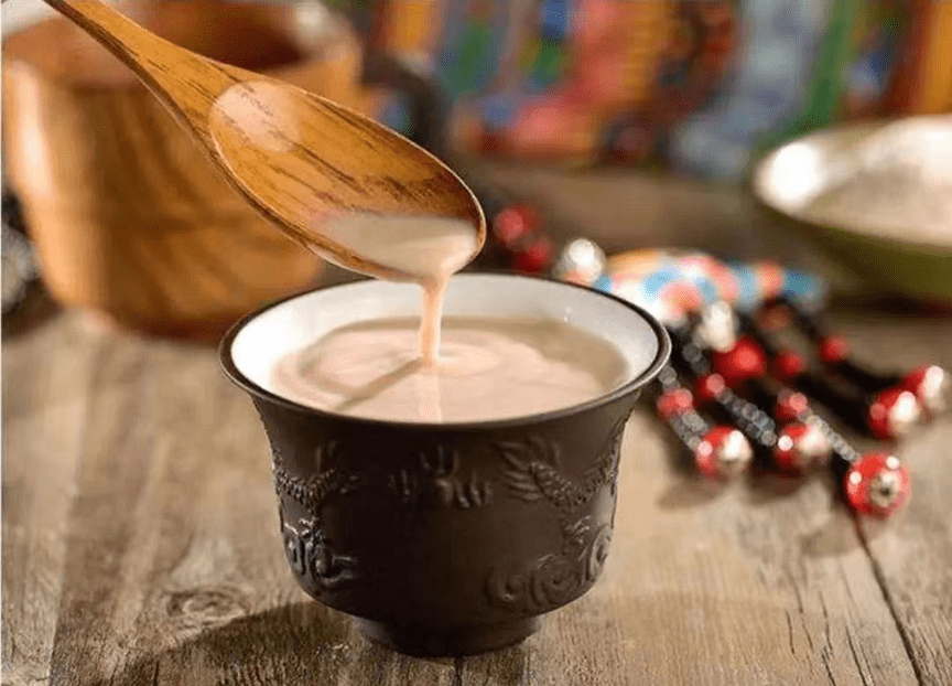 酥油茶是一种在茶汤中加入酥油等作料,再经特殊方法加工而成的茶汤。喝起来咸里透香,甘中有甜,它既可暖身御寒,又能补充营养。在高寒地区,喝上一杯浓浓的酥油茶,十分温暖。