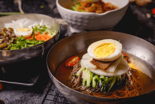 延边冷面甜辣爽口,清凉不腻。在冰凉的荞麦面上放上牛肉片、鸡肉丸、黄瓜丝、切成瓣的熟鸡蛋、辣白菜或卷心菜泡菜、苹果片或梨片,一碗“气象万千”的冷面端到面前,既饱眼福更饱口福。