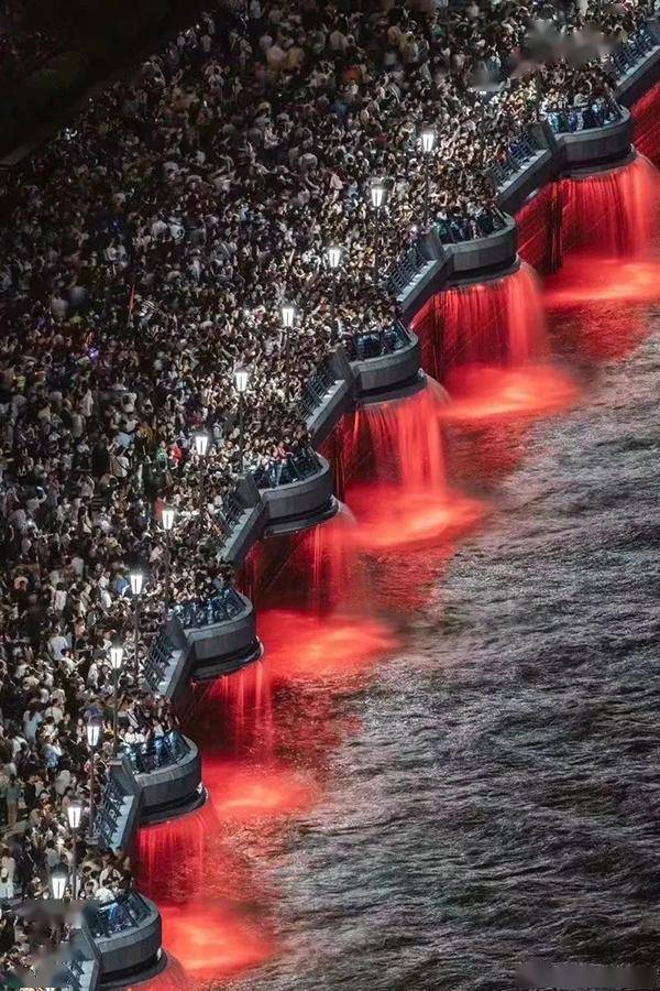 比如大热的照片中的外滩观景平台红色小瀑布串联构成的曲线,其实就是风光片中常用的对角线构图方式。此外,亲水平台岸边的路灯也是一条呈现对角线构图的曲线,灯光的照射也让人群的层次更加丰富——越靠近黄浦江边,人越多、密度越大、人群的亮度越高。