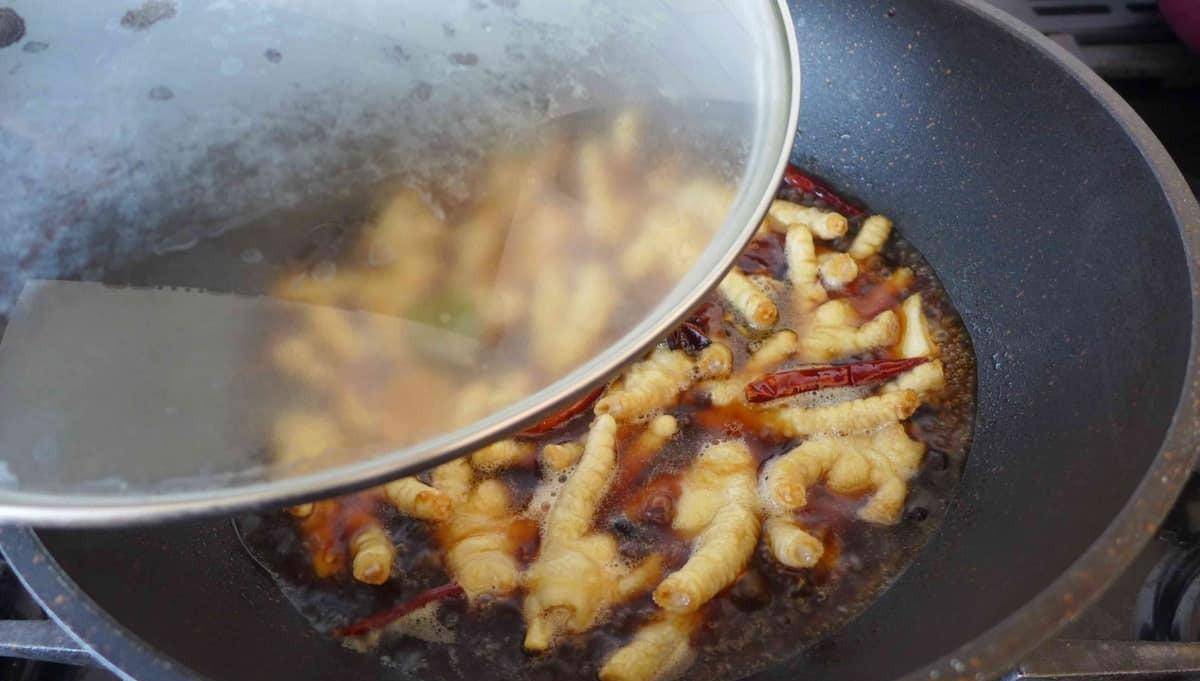 把它烧开,然后盖上盖子。用小火炖30分钟左右,直到鸡爪的皮肤变软。