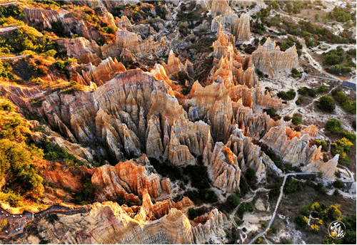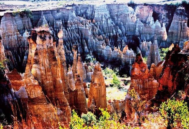众多土柱、土墙连成一片,构成土的丛林,如遇日出日落,金色的日光打在土林侧面,金红的颜色瞬间被激发,渲染出一幅绚烂的画卷。