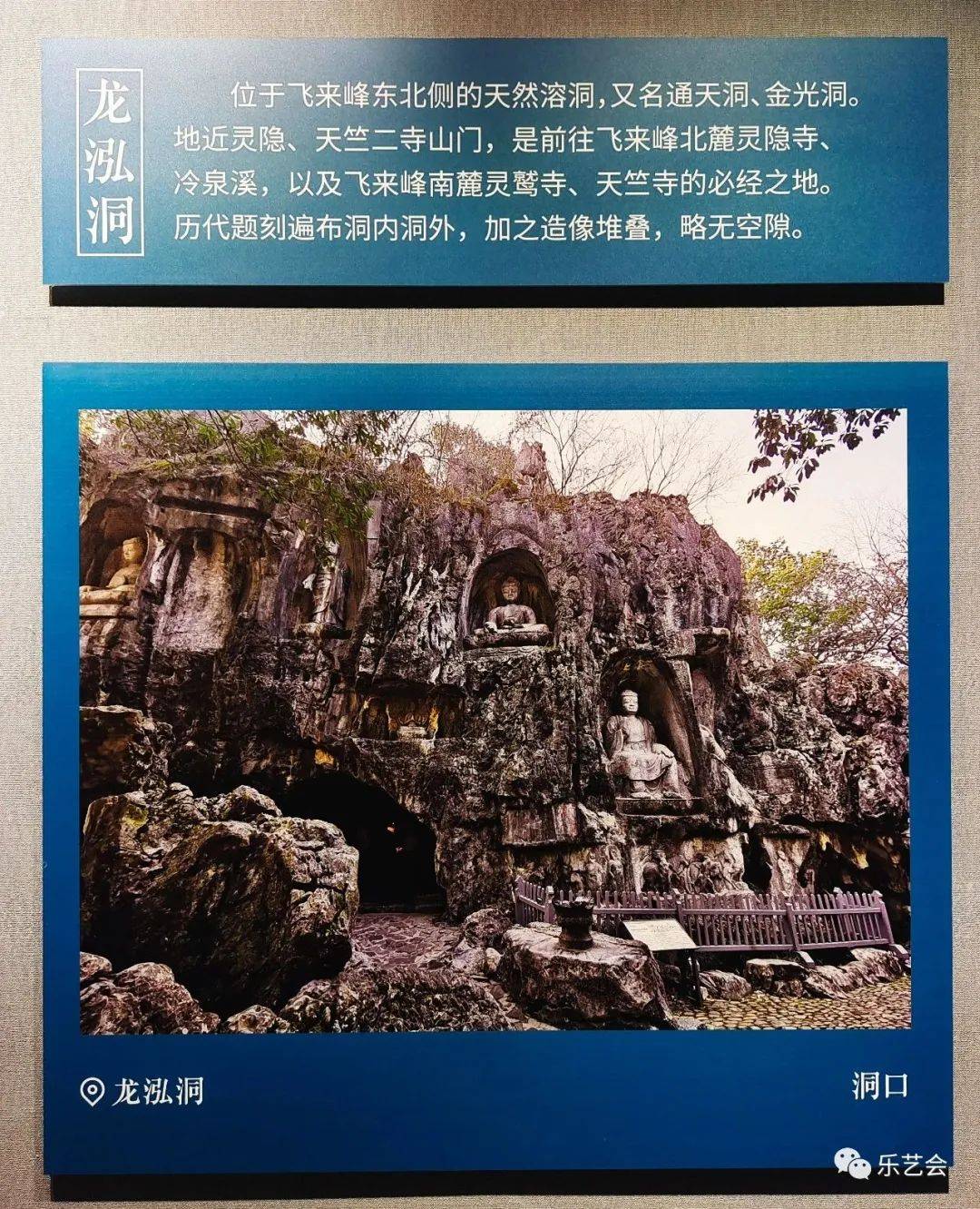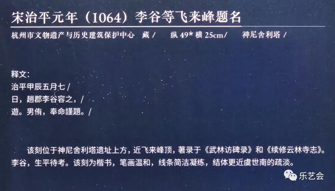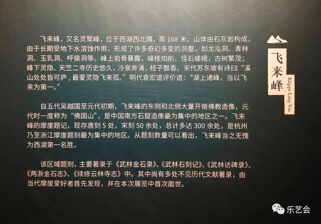 自五代吴越国至元代初期,飞来峰的东侧和北侧大量开凿佛教造像,元代时一度称为“佛国山”,是中国南方石窟造像最为集中的地区之一。飞来峰的摩崖题记,现存唐刻5处,宋刻50余处,总计多达300余处,是杭州乃至浙江摩崖题刻最为集中的地区。从题刻数量可以看出,飞来峰当之无愧为西湖第一名胜。该区域题刻,主要著录于《武林金石录》、《武林石刻记》、《武林访碑录》、《两浙金石志》、《续修云林寺志》中。