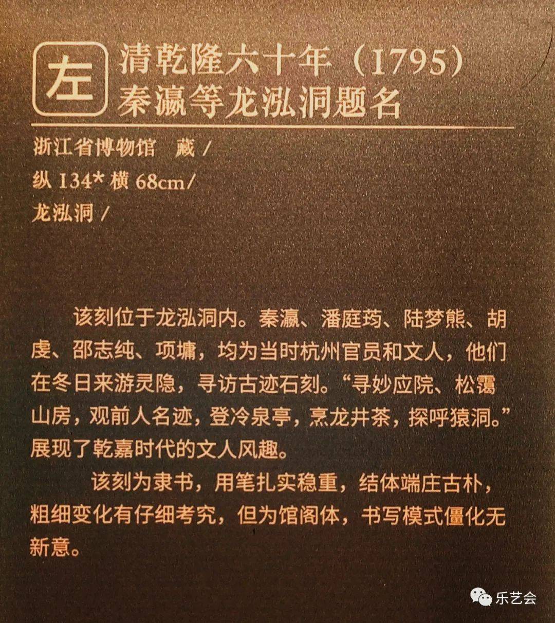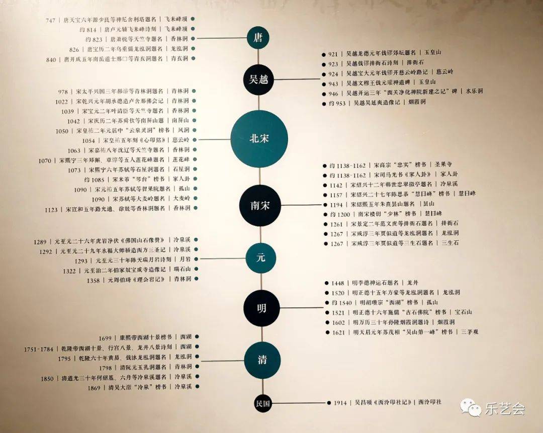 最早的唐代题刻主要集中在天竺寺、定山风水洞等地,五代吴越题刻主要以造像记为主,宋代题刻主要集中在飞来峰、南屏山、烟霞岭等地,元代的题刻多为造像记,明代题刻则以大字榜书为主,清代时更由康熙、乾隆两帝题刻西湖十景、龙井八景等景观,最终奠定了后世杭州西湖文化景观的格局。