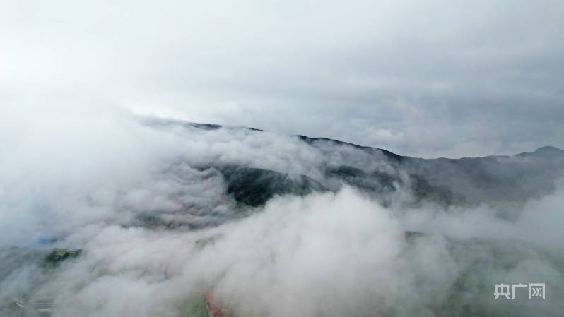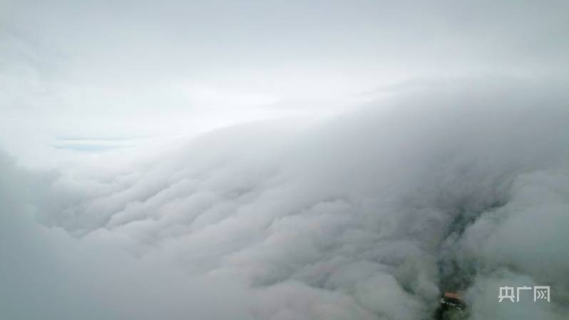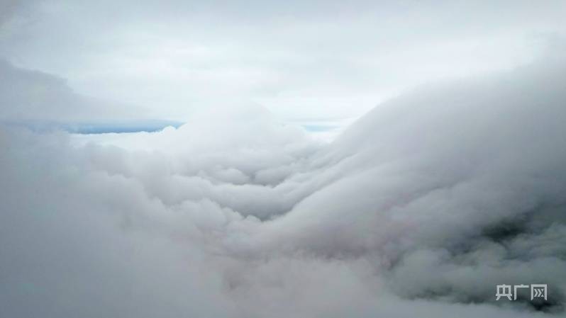 无人机飞至200米高空,终见磅礴瀑布云涛奔涌而来。山岭间皆是云雾飘逸、弥漫四合,小天池方向瀑布云景观最为壮阔,云涛借着强劲偏北风,从山顶俯冲而下,淹没了大山旷野,在长江方向卷起了美丽的浪花。而牯岭长冲河谷则是另一番景观。