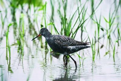纤细的长腿,搭配着红色“皮靴”,一身黑袖白衣,身姿绰约、仪态蹁跹。偶眺望远方,笔直站立;偶低头啄食,水面嬉戏。氤氲水汽间,黑翅长脚鹬翩然飞舞。它扬起细长的嘴,舒展翅膀抖动着尾羽,“扑闪扑闪”地展翅翱翔,优雅之余还发出悦耳的鸣叫声。