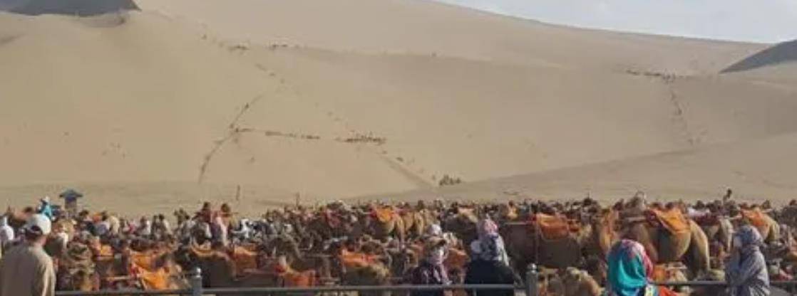 五一期间,敦煌鸣沙山月牙泉景区的入园人数已经破万次,地面项目最受欢迎的就是骑骆驼。景区还有专门为骆驼设置的红绿灯!到了人流量较高的时段,行人的步道和骆驼的通道有两个交叉点,时不时会出现拥堵情况,由此可见敦煌的火爆程度。