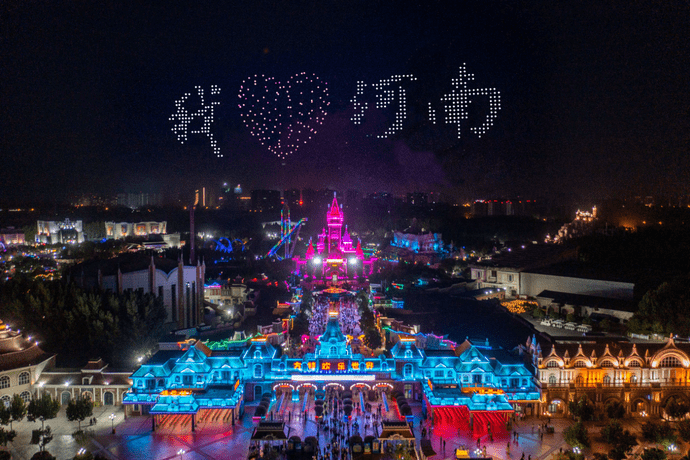 篝火狂欢载歌载舞、知名Coser轮番登场、无人机光影秀浪漫来袭……今年五一假期,当夜幕降临,数百架无人机汇聚在“方特城堡”上空,以星空为画布,以灯光为画笔,用极具特色的图案、起落交错的队形、变幻绚丽的灯光点燃在场游客的热情。