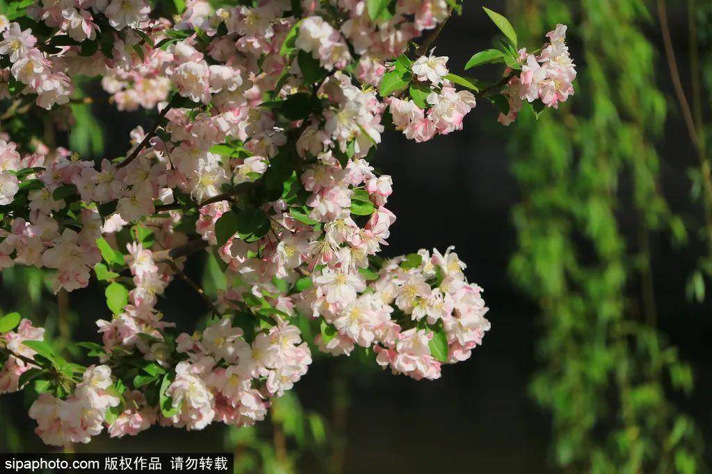 元大都遗址公园的海棠花约在四月中旬进入盛花期。届时,各种海棠花竞相绽放,似云似海,如溪如流。微风乍起,花潮涌动,暗香袭面。粉白相间的花儿,一眼望去,花潮如海。逝去的花瓣,随风铺洒在小月河沿岸,妆扮着如诗如画的花溪。花丛中蜂飞蝶舞,游人如织。