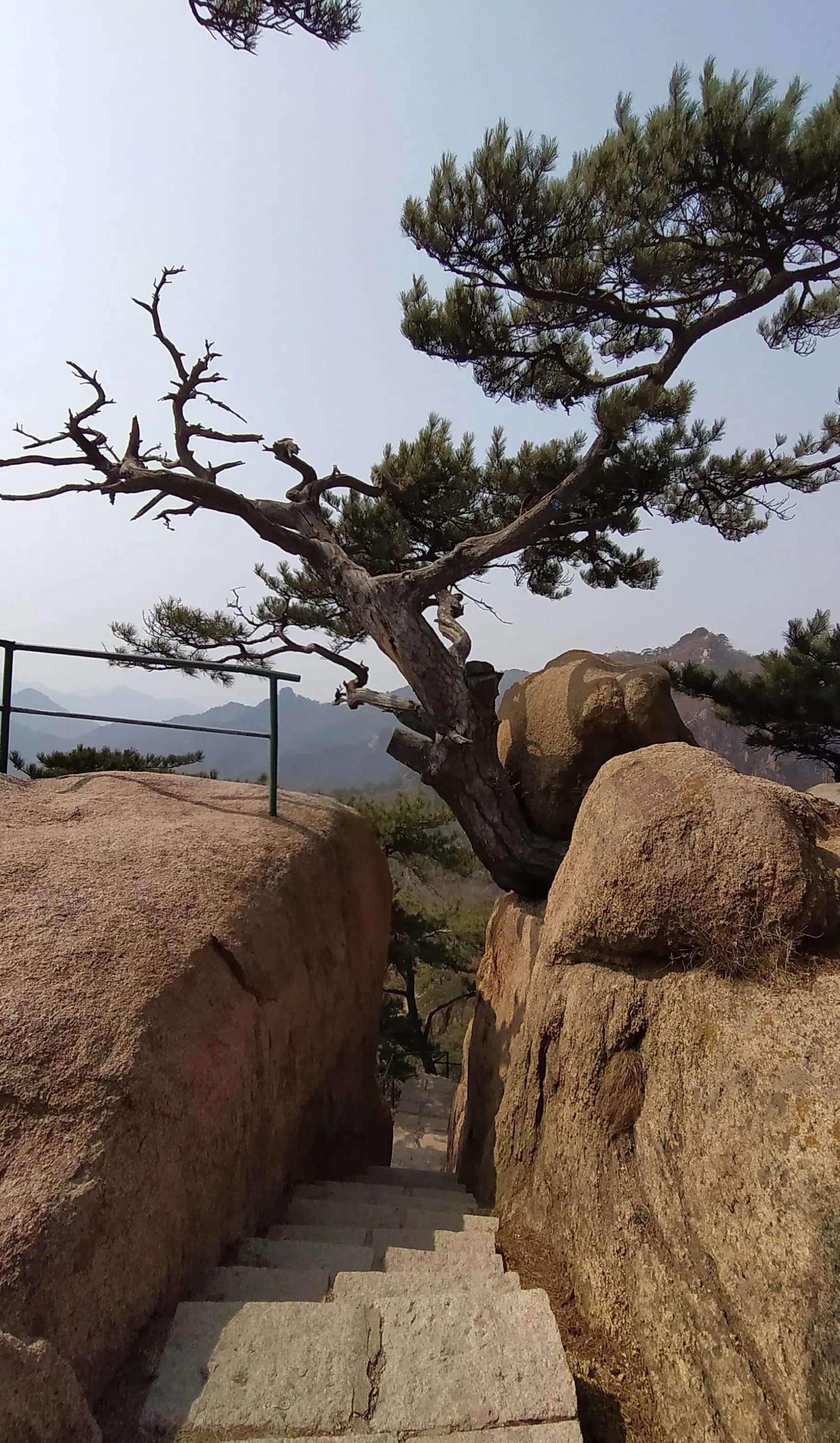 继续沿着石阶向前走,比较有名的有情侣松,其中一棵挺拔,一棵婀娜。过了情侣松,有一段坡度较陡立的石阶需格外小心。