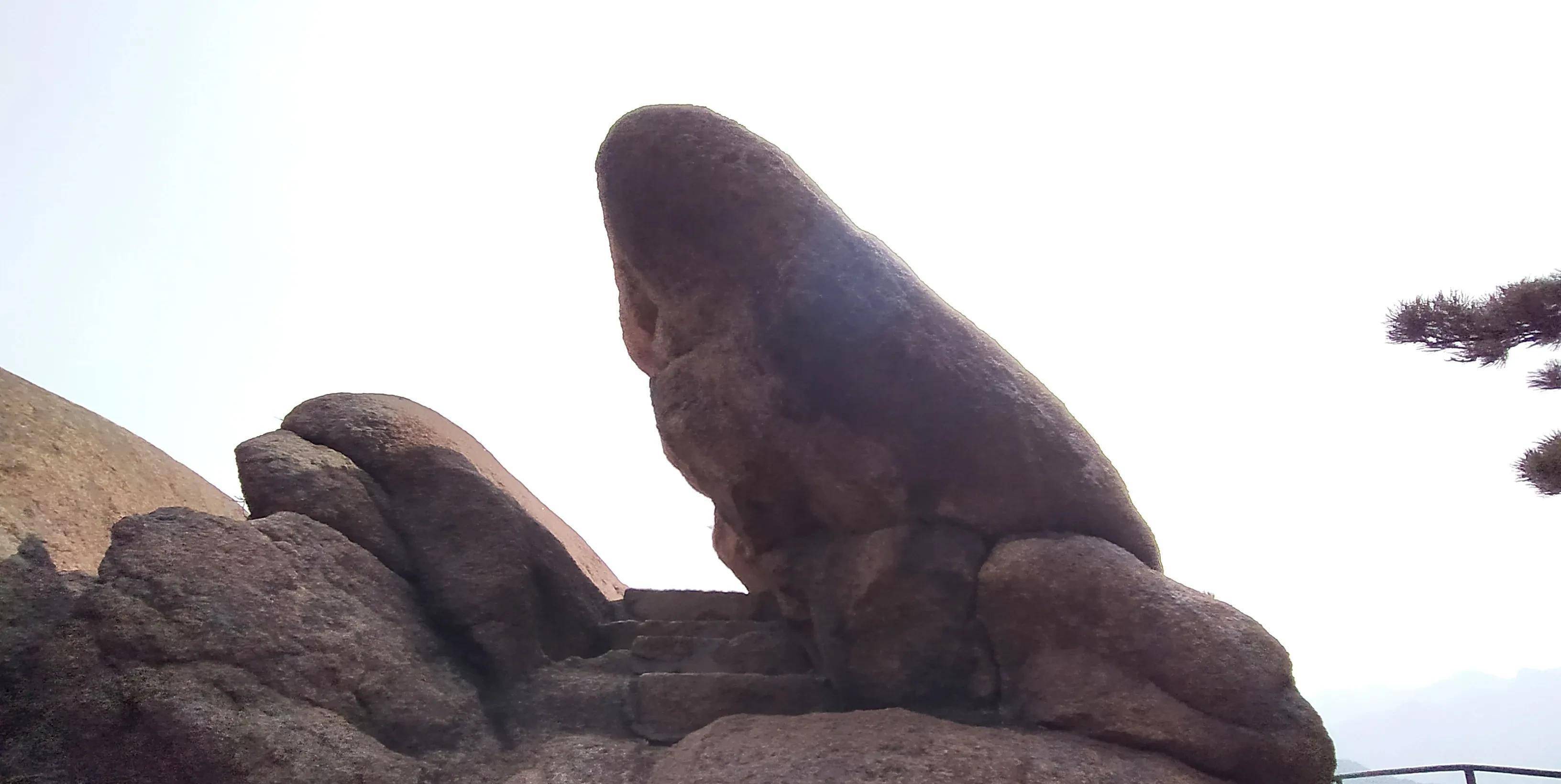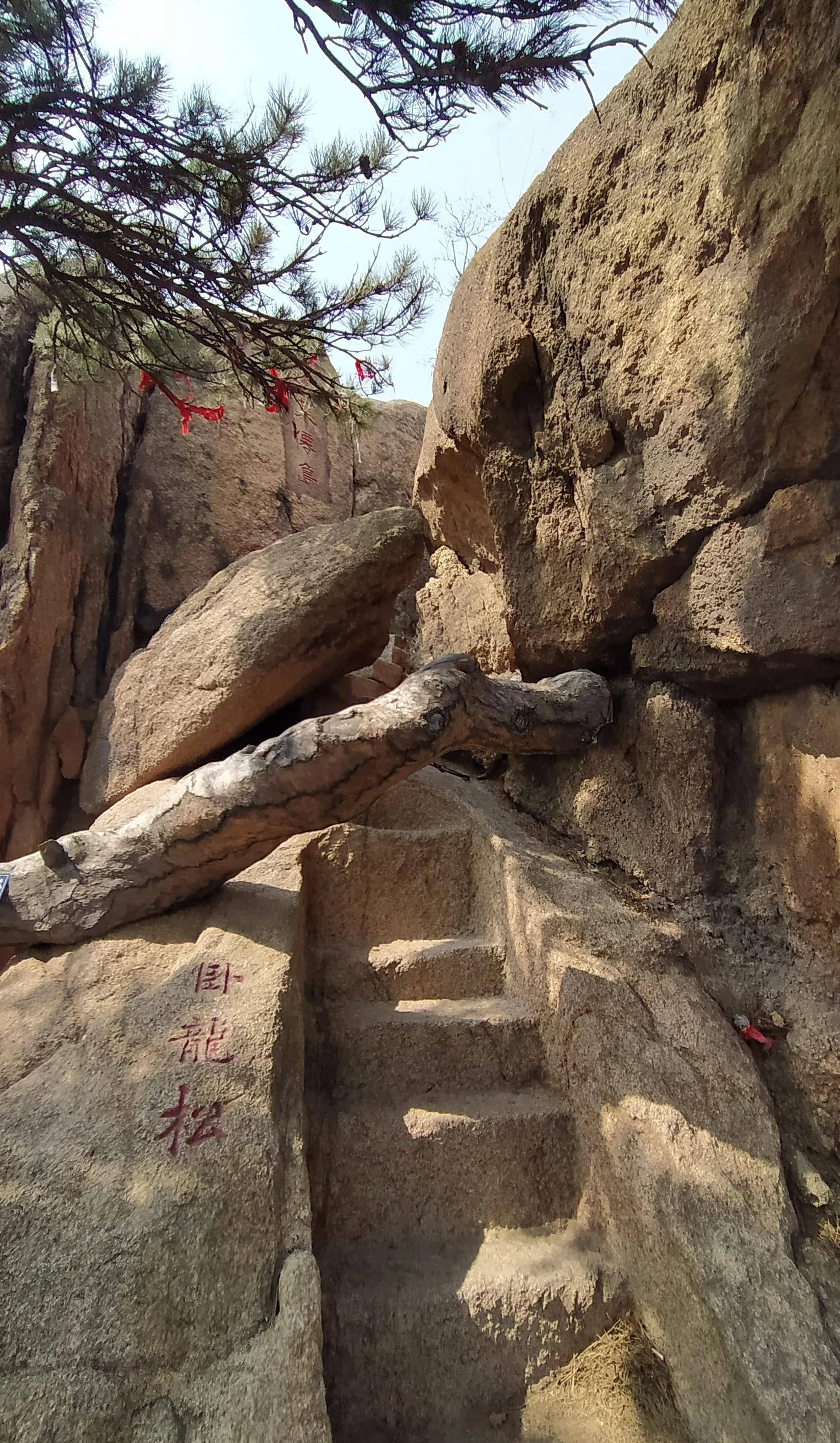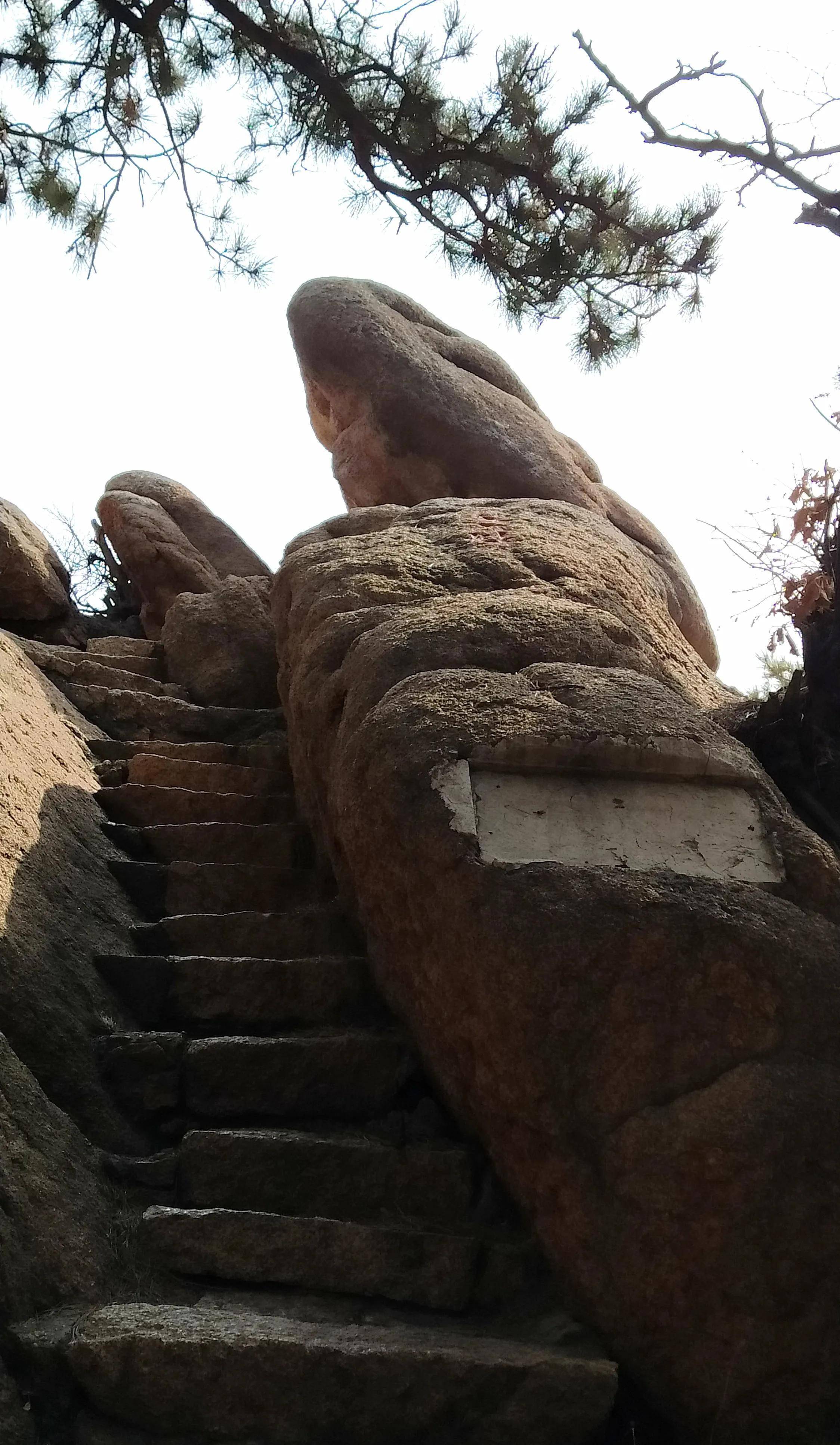 进入景区后有标识的景点就多了,这是探海松,上面的岩石提有“松鼠拜日”。这段石阶陡峭,可以绕行。