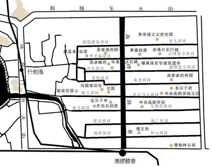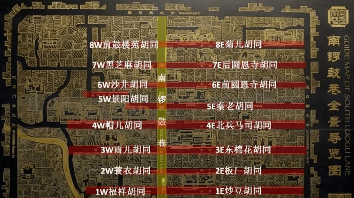 南锣鼓巷延续着元大都棋盘式的城市建筑格局,北起鼓楼大街、南至平安大街,全长780多米,东西各排列8条胡同,呈鱼骨状,俗称蜈蚣街。从南向北,西面的8条胡同是福祥胡同、蓑衣胡同、雨儿胡同、帽儿胡同、景阳胡同、沙井胡同、黑芝麻胡同、前鼓楼苑胡同、后鼓楼苑胡同、南下洼子胡同等;东边的8条胡同是炒豆胡同、板厂胡同、东棉花胡同、北兵马司胡同、秦老胡同、前圆恩寺胡同、后圆恩寺胡同、菊儿胡同。