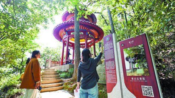 爬至半山腰悬崖处,古蹬道左边就是伟人亭。此处绿树成荫,视野宽阔,是游客休息观景的重要之所。“这里记录着一代伟人毛泽东指点江山的豪迈,他曾在此欣赏昭山美景、进行社会调查。”岳塘经开区有关负责人说。