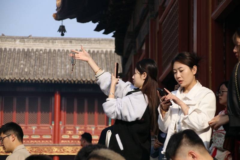 雍和宫景区内,一位年轻游客在为排队买到的手串拍照留念。 陈雪波/摄影
