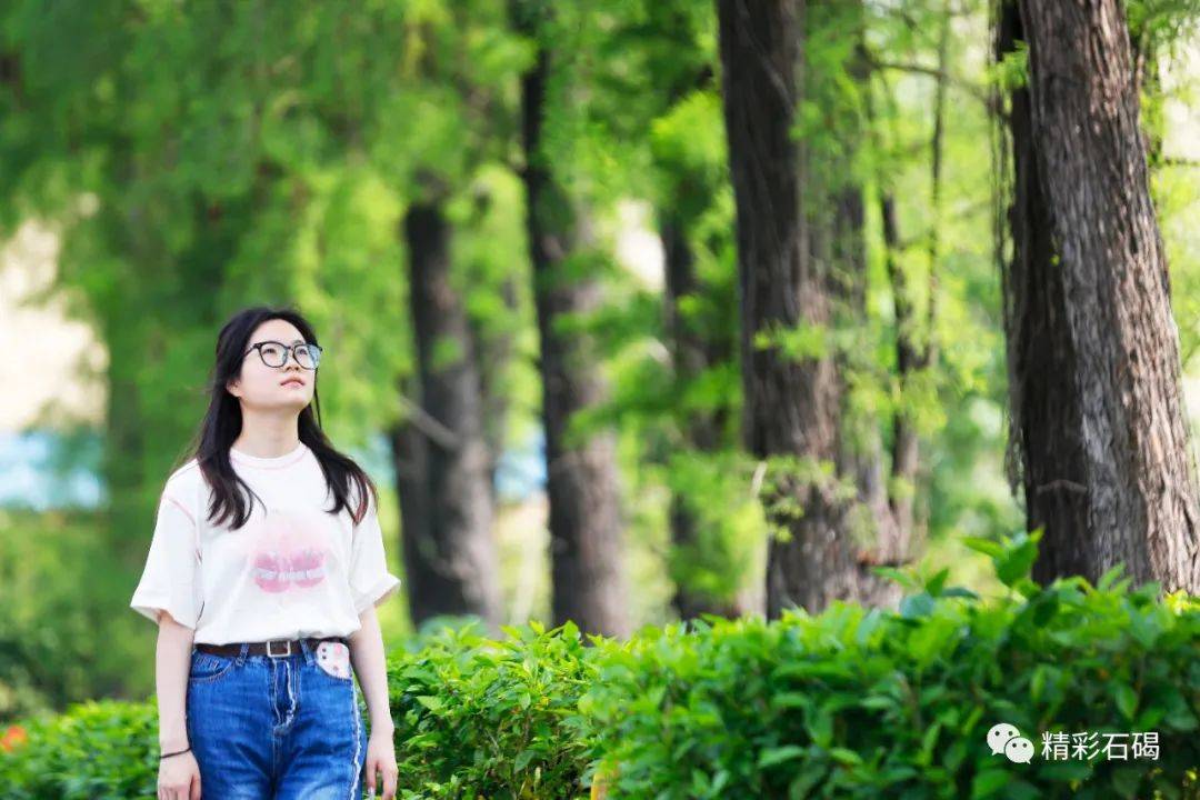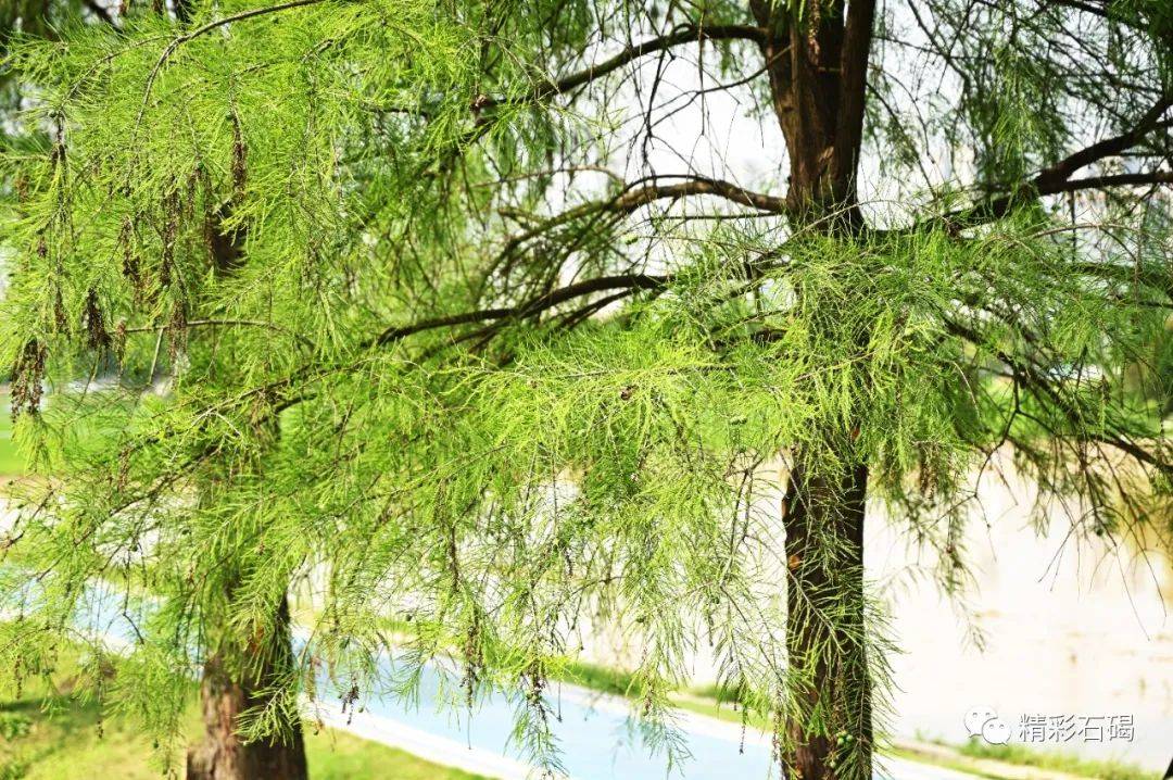 曾于秋冬红叶翩翩的落羽杉,如今换成绿色的装扮。夏天的浓绿葱翠,天空的幽蓝澄净,恰到好处地呈现一幅青绿美学。