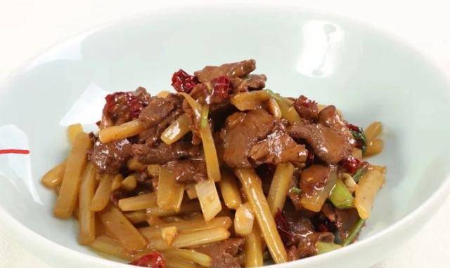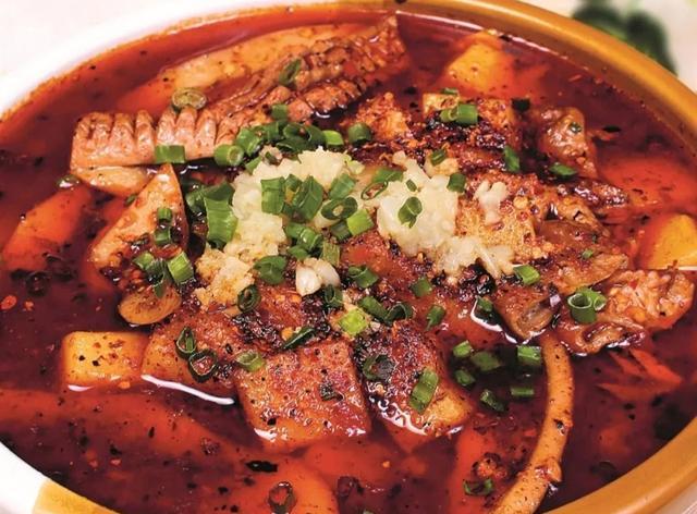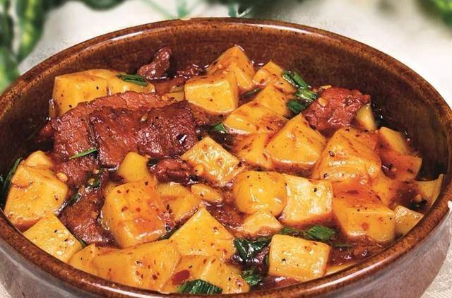 此菜的灵感来源于川菜麻婆豆腐,灵魂郫县豆瓣酱和火锅底料小火炒香,与切方块的搅团一同烧入味,加上过油牛肉片,成菜麻辣鲜香、滋味浓郁,真的好吃极了。