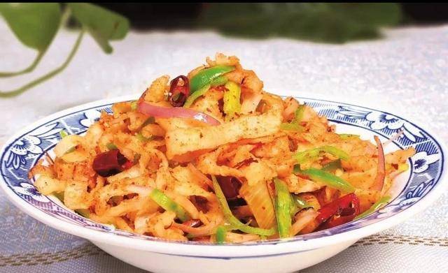 洋芋就是俗称的土豆,陕北当地百姓管土豆称呼“洋芋”、“山馒”。用专用的擦子将土豆擦成薄片,拌入少量玉米面或杂粮面、小麦面粉,制成“洋芋擦擦”,即是主食又是家常菜,广受大众喜爱。这道菜是将蒸好的洋芋擦擦搭配青椒和洋葱同炒,调味时加入十三香和辣椒面增加料香味,成菜麦香微辣,是一道成本低、高利的旺销菜。