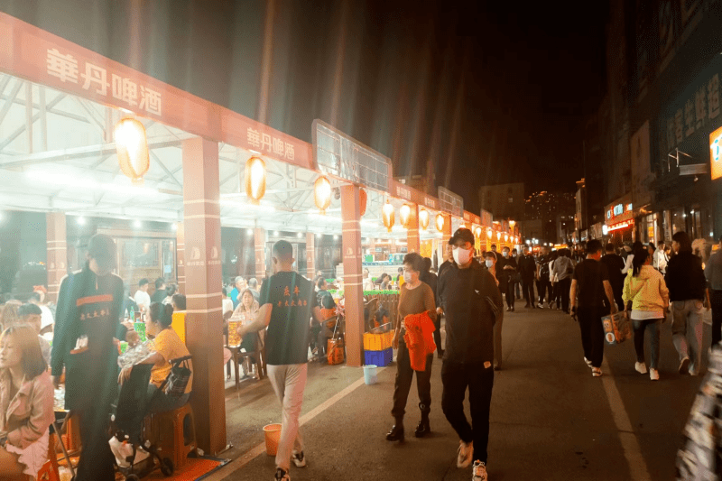 雪花·华丹主题街区灯火璀璨。五一期间已搭建完成上海路、三亚路、宜山路、厦门东街、林苑路5条雪花·华丹主题街区,共包含近90家经营业户,日客流量约2400人次,真正让街区人气“旺”起来,激情“燃”起来,城市 “亮”起来。
