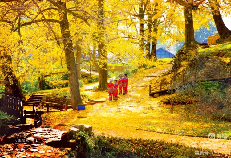 深秋时节,走进妥乐,则犹如走进一个金色的童话世界。小桥、流水、山坡、梯田、瓦房、院落……整个村庄都被银杏叶装点成金色。秋风一吹,遮天蔽日的银杏叶犹如彩蝶一般纷纷扬扬、翩翩起舞,那种壮美让人震撼、令人沉醉!