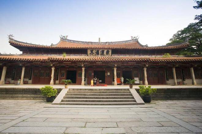 拜庭两旁古榕参天,大雄宝殿雕塑技术高超,尤其是粱槽间的24尊飞天乐伎,在中国国内古建筑中罕见。殿前月台须弥座的72幅狮身人面青石浮雕,殿后廊的两根古婆罗门教青石柱,同为明代修殿时从已毁的元代古印度教寺移来。大殿内用近一百根海棠式巨型石柱支撑殿堂,俗称"百柱殿",殿内供奉的五方佛像,法相庄严,是汉地少有的密宗轨制。大雄宝殿之后的甘露戒坛,系中国现存三大戒坛之一,坛之四周立柱斗拱和铺作间的24尊木雕飞天