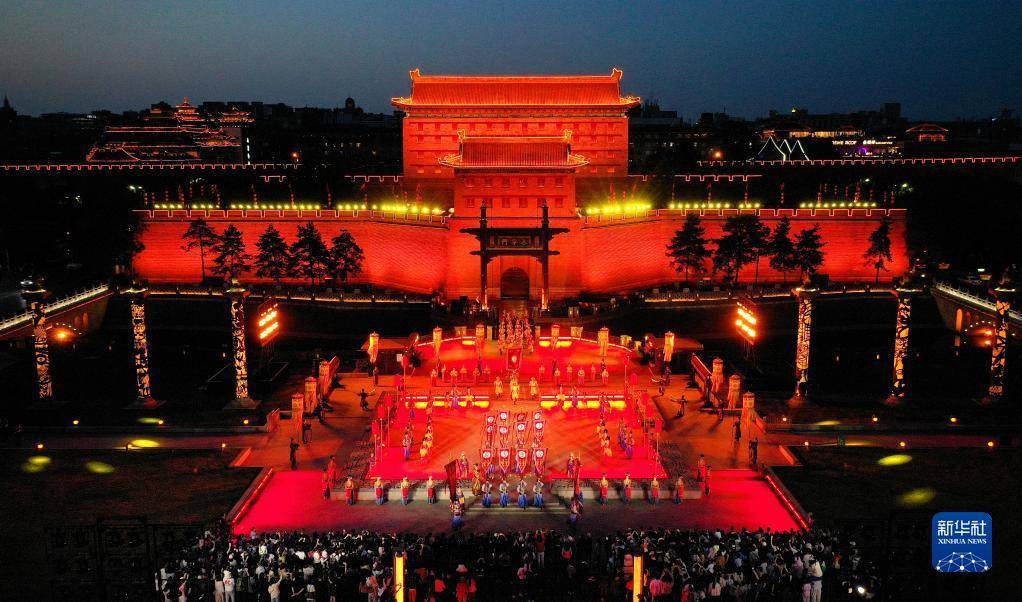游客在西安城墙景区观看《梦长安——大唐迎宾盛礼》(4月30日摄,无人机照片)。