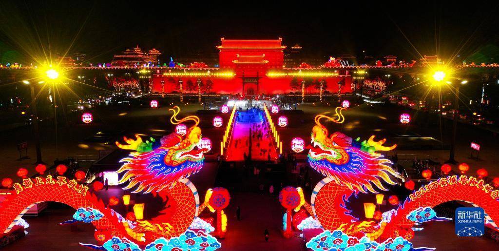 2023年春节期间西安城墙永宁门的花灯(1月26日摄,无人机照片)。