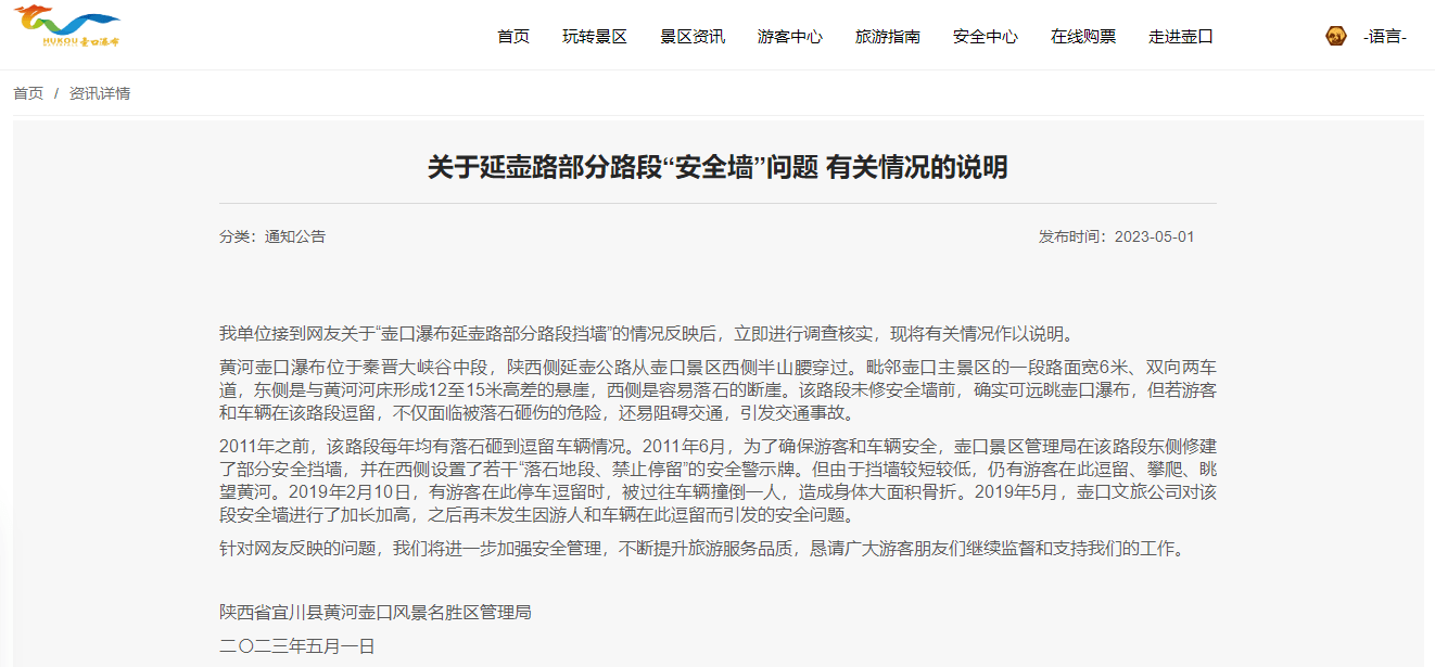 我单位接到网友关于“壶口瀑布延壶路部分路段挡墙”的情况反映后,立即进行调查核实,现将有关情况作以说明。