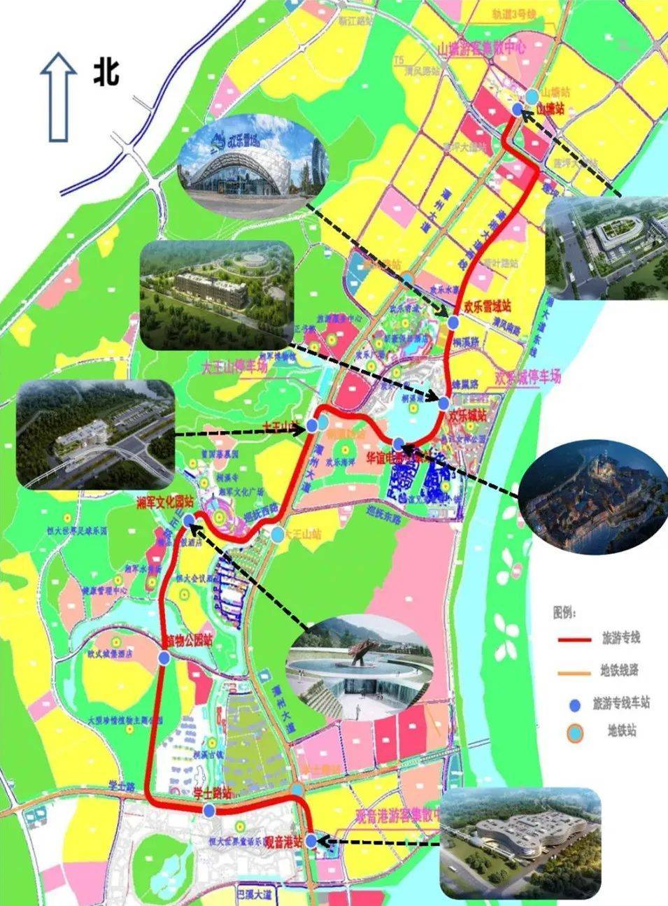 线路全长约8.11公里,共设站9座(山塘站、欢乐雪域站、欢乐城站、华谊电影小镇站、大王山站、湘军文化园站、植物公园站、学士路站、观音港站),设车辆段1座,设计最高时速为80公里,串联欢乐雪域、欢乐天街、湘江女神公园、桐溪湖、华谊电影小镇、欢乐海洋等主要景点。
