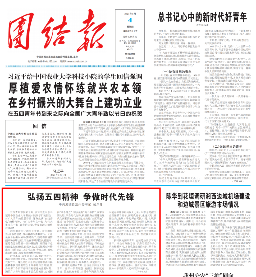 5月4日,湘西州委书记虢正贵发表题为《弘扬五四精神 争做时代先锋》的署名文章。他在文章中指出:湘西广大青年更应当牢记党的教诲,忠诚拥护“两个确立”、坚决做到“两个维护”,高擎五四火炬,争当时代先锋,积极投身全面建设现代化新湘西的火热实践,在打造“三区两地”、建设“五个湘西”的生动实践中汇聚青春力量、彰显青春担当,让五四精神与首倡地荣光交相辉映,在实现“三高四新”美好蓝图的新征程上唱响更加壮丽的青春之歌。