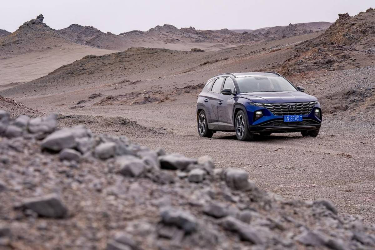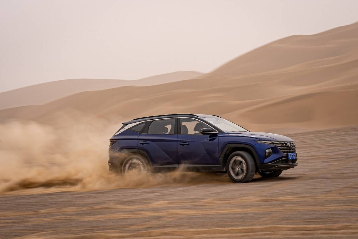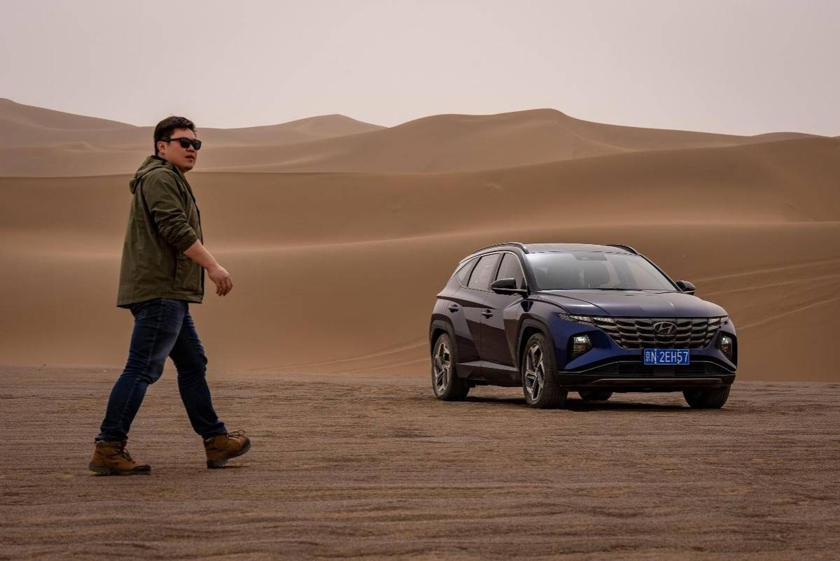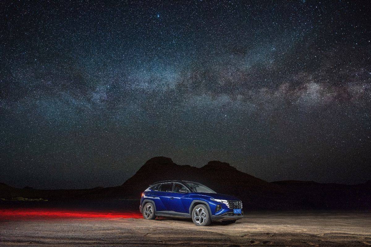 大海道之后的路,变得异常难走,它集合了之前我遇到的所有路况,软沙路面、硬沙搓板路、黑戈壁、连续上坡、陡峭下坡……,在这里要点名表扬一下第五代途胜L 8AT的动力系统,真的是又给力有耐造。这段路途你需要在短距离内加速冲上大坡的提速性能,需要急刹后立刻提速抵消颠簸的动力连贯性,需要软沙上动力线性输出的平顺性,还需要保持燃油经济性,让我们可以抵达目的地。如此严苛的考验,1.5T+8AT完全经受住了,令人欣慰,为了犒赏它,我们决定在夜空下给它拍一张美美的照片,当然了,车还是我擦的。