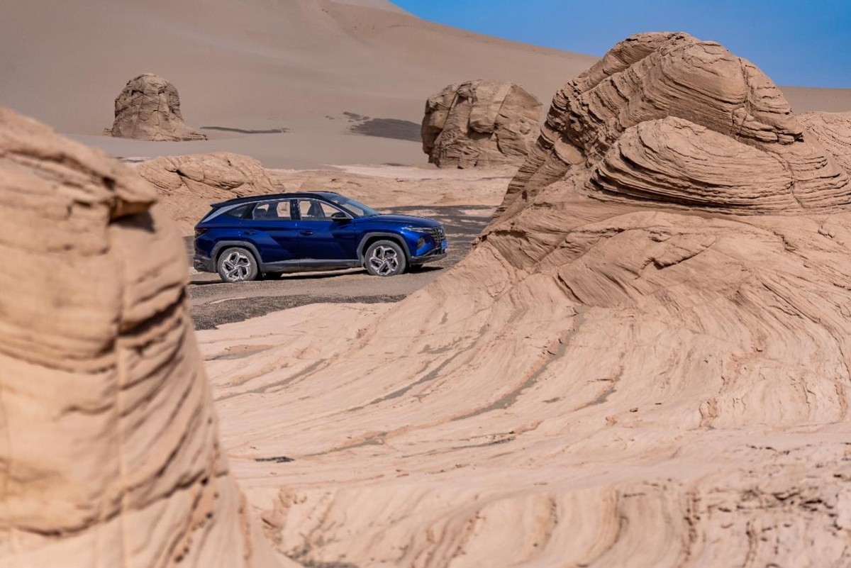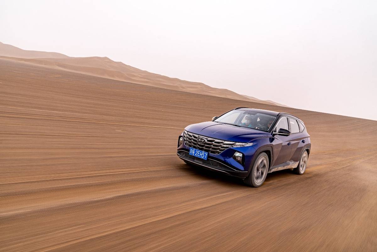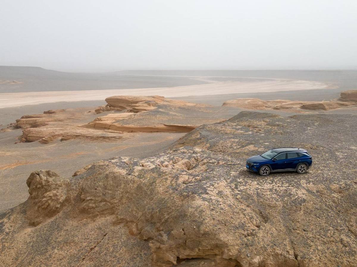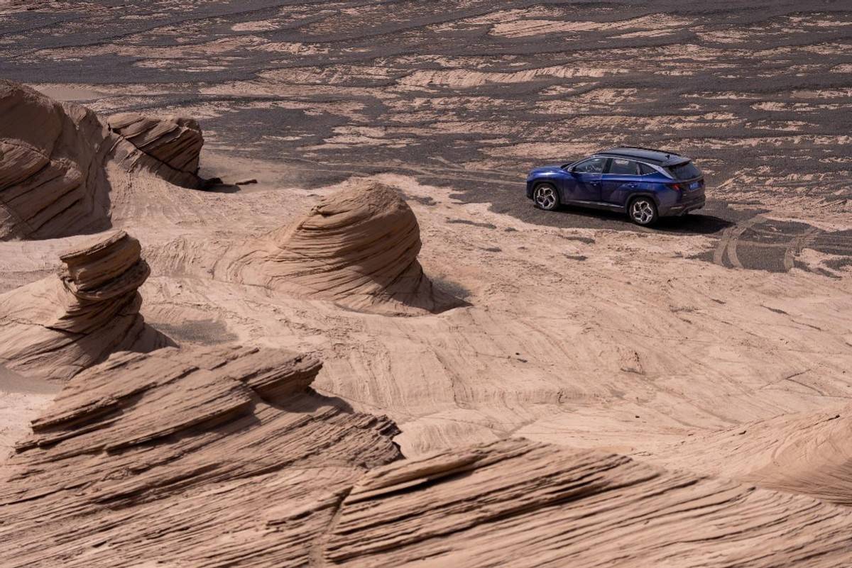 大海道之后的路,变得异常难走,它集合了之前我遇到的所有路况,软沙路面、硬沙搓板路、黑戈壁、连续上坡、陡峭下坡……,在这里要点名表扬一下第五代途胜L 8AT的动力系统,真的是又给力有耐造。这段路途你需要在短距离内加速冲上大坡的提速性能,需要急刹后立刻提速抵消颠簸的动力连贯性,需要软沙上动力线性输出的平顺性,还需要保持燃油经济性,让我们可以抵达目的地。如此严苛的考验,1.5T+8AT完全经受住了,令人欣慰,为了犒赏它,我们决定在夜空下给它拍一张美美的照片,当然了,车还是我擦的。