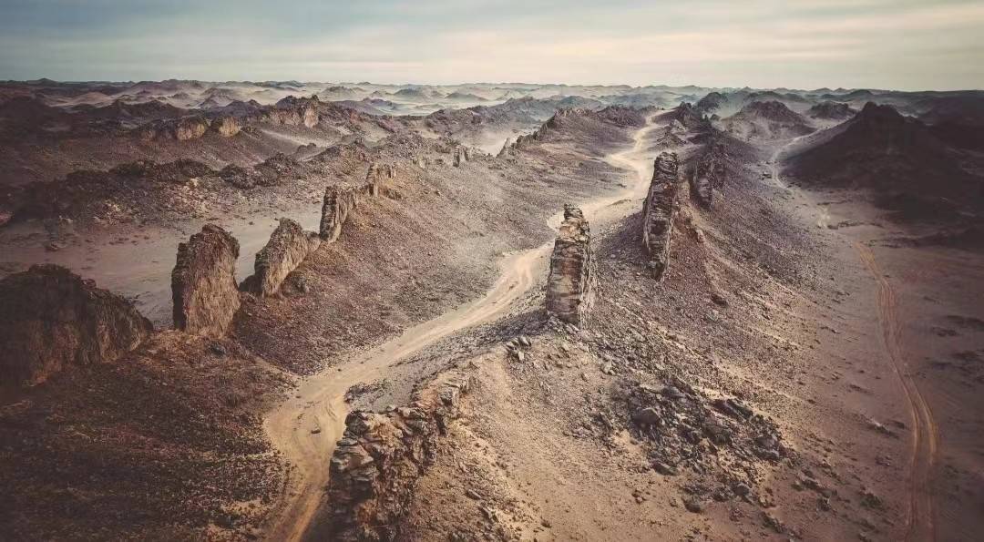 完全进入黑戈壁之后,穿越难度陡然升高。沙漠路段最担心的是陷车,而在戈壁上要时刻注意地面上凸起的尖石头,一棵棵像石笋一样的尖石头在随时准备着刺穿我们的底盘和轮胎。能躲则躲,实在躲不开了,也只能硬着头皮向前冲,小石头一脚油,大石头一闭眼。