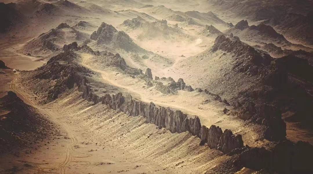 逐渐车轮下的黑色向两边退去,转变为浅黄色的龟裂地面,虽然很颠簸,但这应该是我们穿越路线中路况最好的一段。这里实际上是干涸的河床,我本以为应该是干涸了成百上千年的时间,但是后来问过当地人,说每隔五六年,这里就会发一次洪水。真是令人颠覆认知,如此干燥的环境,竟然会发洪水,而且每隔几年就会有一次。