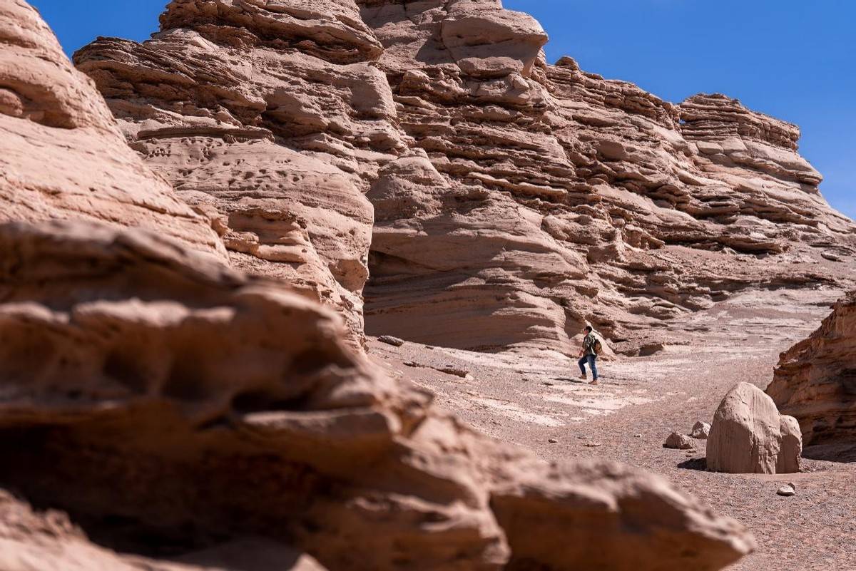 露营的地方叫做小南湖,夜里并没有看出来它的奇特,但是天亮后发现,这里是一个缩小版的大海道,属于雅丹地貌的成长期。“雅丹”原是我国维吾尔族语,意为陡峭的土丘。在长期的地质风化作用下,风和流水可以带走疏松的沙土层,荒漠区变化剧烈的温差所产生的胀缩效应能够让坚硬的泥岩层发生崩裂,暴露出来的沙土层被水和风带走,逐渐演变为凹槽状。再加上雨雪水的冲刷作用,使得崩裂的缝隙加宽扩大,大风对裂隙不断进行剥蚀,沙土层慢慢形成风蚀沟谷和洼地,被留下来的坚硬的岩石则形成孤岛状的、大小不一的长条形土墩。所以雅丹是会生长的,但是我估计这里最终也不会成长成大海道那种壮丽磅礴的样貌,但是它依然很美。