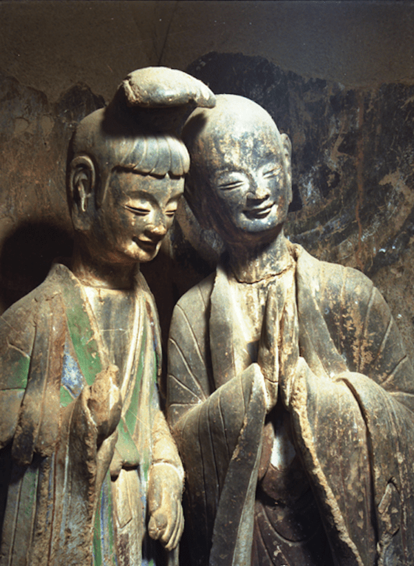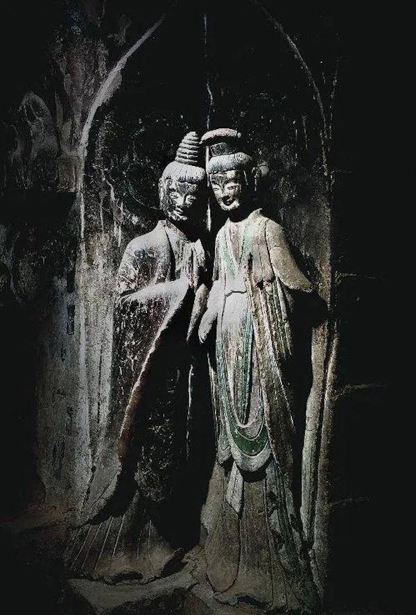 第121窟正壁右侧胁侍菩萨与弟子的微笑这两尊塑像,也是北魏时期(公元386-534年)的作品。北魏时期是我国历史上佛教比较兴盛的时期之一,其早期中期和晚期,佛教艺术都有条明显的演变轨迹,即从浓重的异域色彩演变为中期的融合风格,进而演变为晚期的思辨特征。这121窟的胁侍菩萨和弟子,专家们认定即是属于北魏晚期的作品。他们虽极富世俗生活化的写照,但仔细看来,他们的行为举止确是浸透了浓浓的思考与辨识。他们身体轻倚,思绪共振,得体地进行着意会的交流,“窃窃私语”,脸上洋溢着甜蜜得无法形容的你我都似曾有过的微笑。他们这既似聆听佛讲经说法的心灵颤动和赞叹,也似受到佛学哲理感染后的由衷愉悦与激情的合理表达,还似菩萨与弟子这姐弟般关怀、启迪与对美好境界的追求与遐想。他们在微笑中收获,他们在收获中微笑,他们把美丽的心情和一颗感恩的心全部安顿在了恬适融融的微笑之中。的确,这组雕塑是在我所见过的诸多雕塑作品中,也包括在麦积山的微笑作品中十分特别的一组,他们的微笑不仅在脸上,更在心中,更在每一个细胞中,我觉得他们似乎还要告诉所有见过他俩微笑的人,要微笑就该是这般的微笑。
