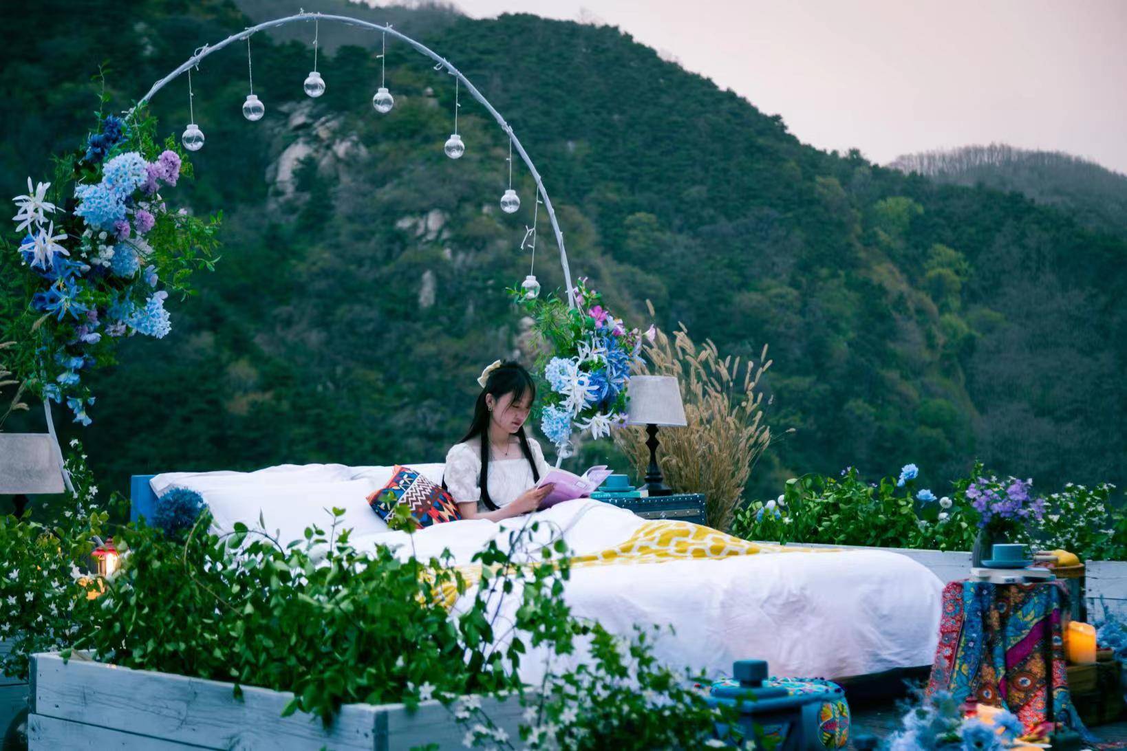 暮光森林,俯瞰如镜面一样的碧绿色天池,去嗅山林间清风牵引的花香。聆听万物白噪声、疗愈人生。在山谷露营也要有仪式感,帐篷天幕、复古摆件,灯串氛围感满满,随便一拍都是大片。
