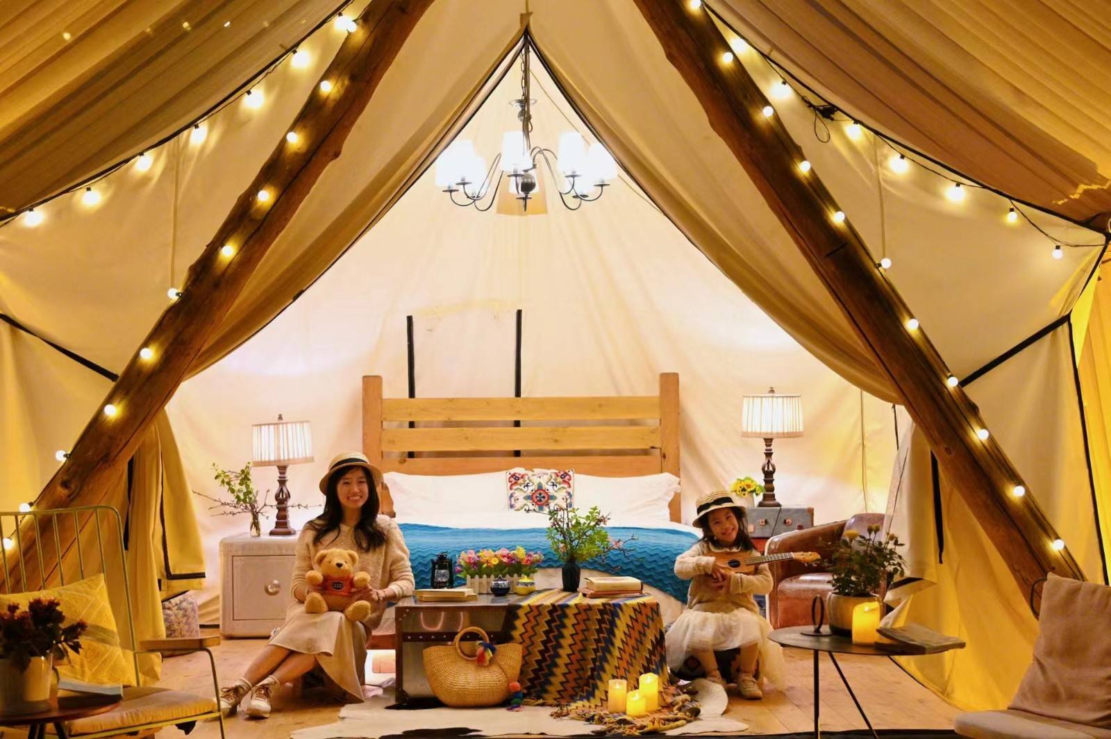 与自然共呼吸,把精致的生活搬到户外。轻柔的微风,花朵的清香,完全置身于原生态露营环境,远离尘嚣,怡然自得。大空间野奢帐篷,北欧风五星级配置、比利时进口床垫、斯得福布草、高档洗护用品一应俱全。浪漫实用并俱,快带着家人拎包入住,畅享亲密无间的慢时光吧。