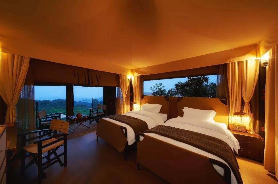 🔸 十五顶自然探险风格的客房帐篷内,陈设考究,简约而不简单,充满了设计感,几乎是复原了大发现时代的风格,而且非常舒适。干爽时节帐篷可以做到四面全开,360度被森林环绕包裹,惬意地品茶、品酒、翻翻博物书籍、静静地欣赏自然景致,是置身于荒野自然里最极致的享受。