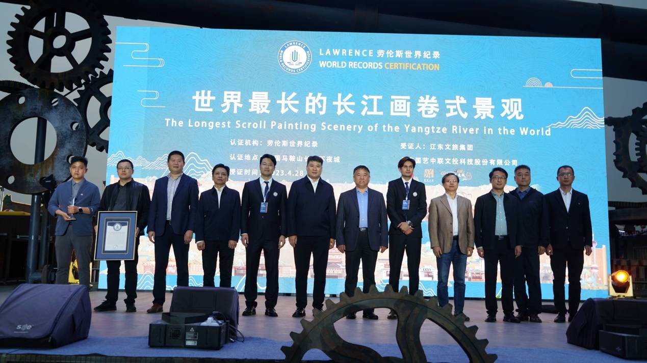 4月28日,长江不夜城千里长江画卷世界纪录认证仪式在马鞍山长江不夜城内举行,活动中《千里长江画卷》景观获得劳伦斯世界纪录认证“世界最长的长江画卷式景观”。活动现场气氛热烈,马鞍市市委常委、宣传部部长陈永红,国艺中联集团董事长刘兵,市政府副秘书长何俊等领导出席本次活动。