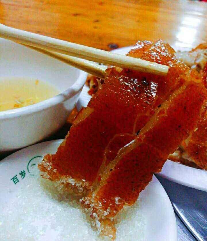 制作好的烤乳猪,色泽红润,而且形态很完整。猪皮酥肉嫩,吃起来肥而不腻,入口奇香。与众不同的是,广东吃乳猪,蘸糖最好吃!