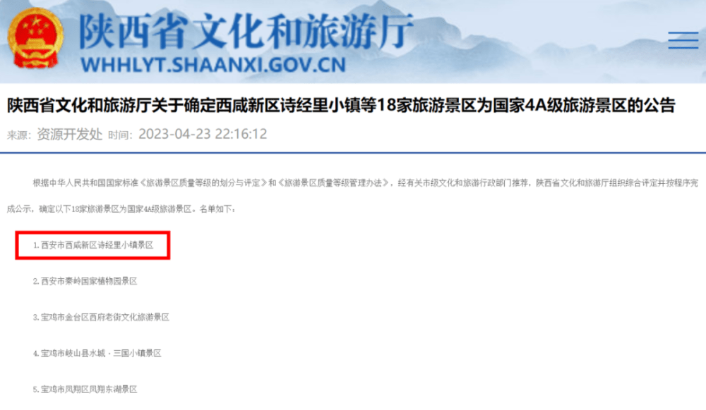 诗经里小镇入选国家4A级旅游景区(央广网发 陕西省文化和旅游厅官网截图)