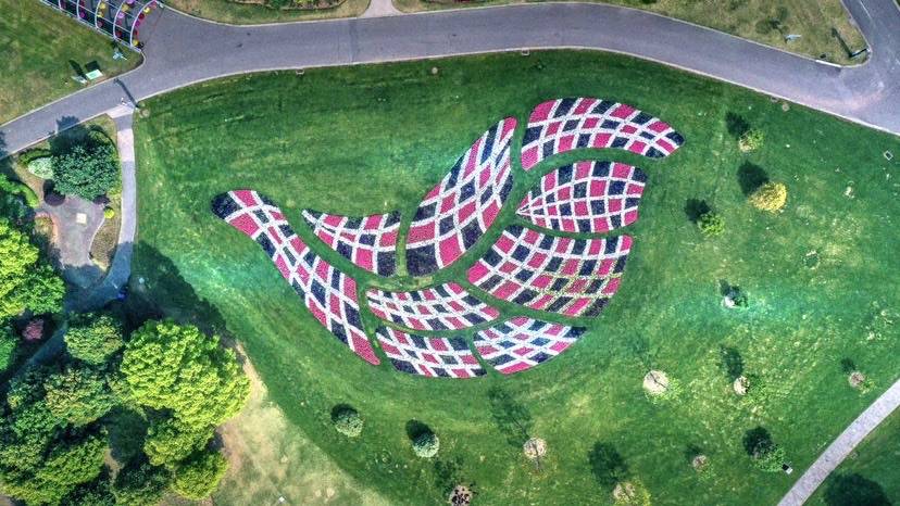 整个花坛由顺应花坛形状与地形变化、远观呈空中“飞毯”状的白色网格划分,紫色与粉色花卉相间而植、嵌入其中。这种图案的优点在于,游客在沉浸式体验花坛之美的时候,一眼就能识别出网格元素,而网格形成的整体图案又浑然一体,不显突兀;此外,花坛种植植物由富有强烈对比的白色、深紫与玫红色花卉组成,在绿色草坪背景的映衬下,显得格外亮眼。