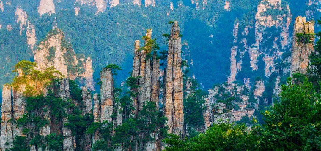张家界有大量绝壁林立的峰林,但它为什么不叫“丹霞地貌”而叫“张家界地貌”呢,就是因为张家界的岩石是在4亿多年以前的“泥盆纪”的原始海洋中形成的,后来经过雨水侵蚀、岩石崩裂,最终形成了上千根特别漂亮的石柱,它跟丹霞地貌不完全一样。丹霞地貌是陆相环境的红层形成的,张家界是海洋环境。