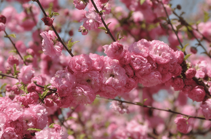 3.榆叶梅,又名小桃红,属蔷薇科桃属灌木,高2—3米,枝紫褐色,叶宽椭圆形至倒卵形,花单瓣至重瓣,粉红色或紫红色,花瓣近圆形或宽倒卵形,花期5月中上旬。
