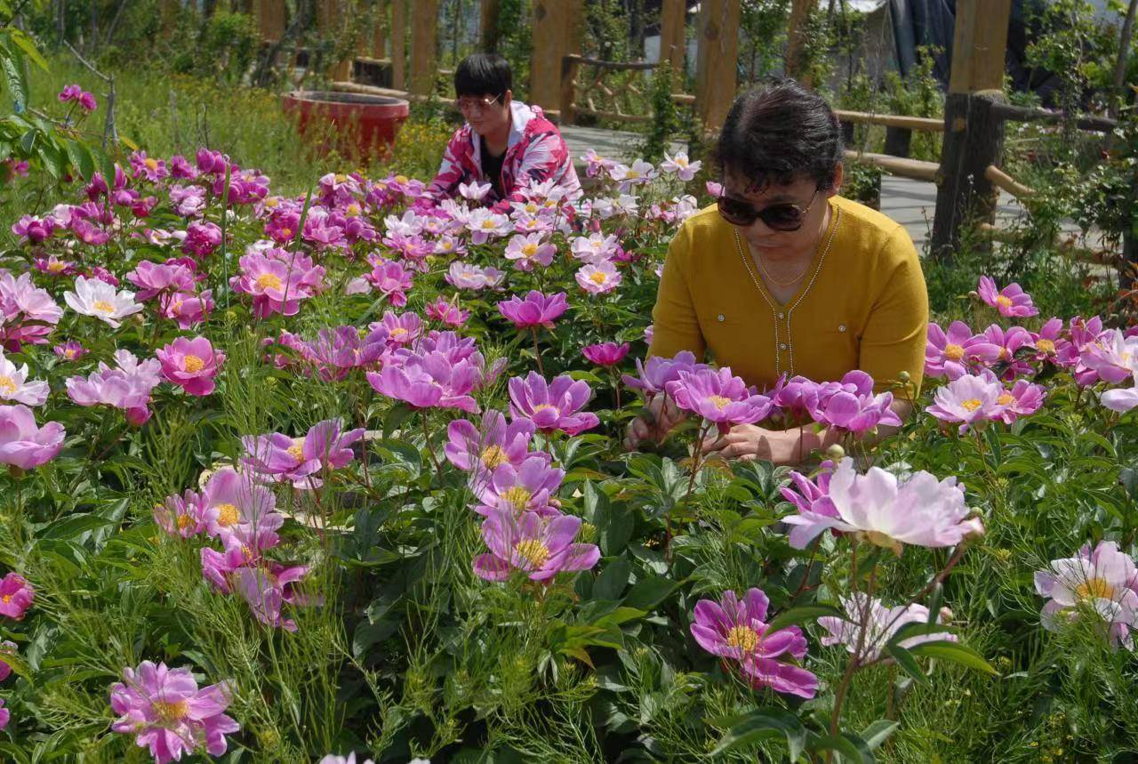 5月8日,青岛市即墨区北安街道周集村农民在芍药基地劳作